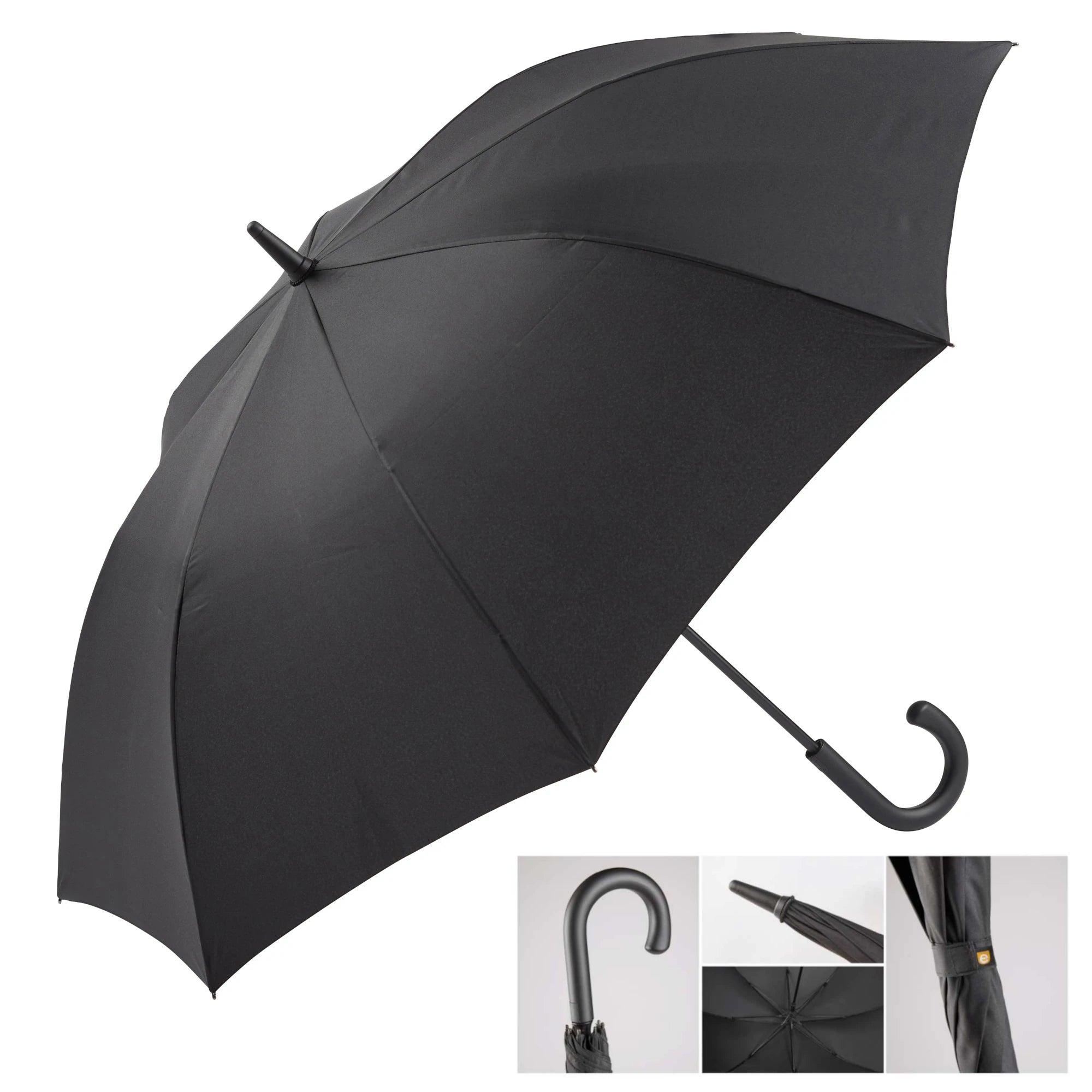 Long black umbrella with an "Open" button for automatic opening.